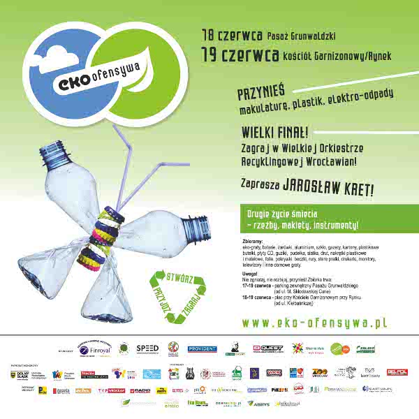 Przyjdź 18 czerwca do Pasażu Grunwaldzkiego i 19 czerwca na plac przy Kościele Garnizonowym (Rynek). Przynieś wszystko to, czego nie potrzebujesz – zbuduj EKO Wrocław, zagraj w najbardziej energetycznej Orkiestrze Recyklingowej świata i poznaj „Pogodę na EKO” Jarka Kreta, Republiki Czadu i wielu innych gości.