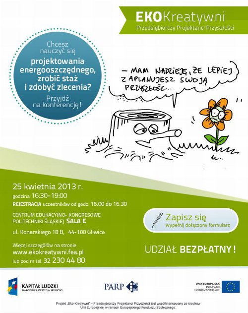 Konferencja „Ekokreatywni” Przedsiębiorczy Projektanci Przyszłości odbędzie się 25 kwietnia 2013 roku w Centrum Edukacyjno Kongresowym Politechniki Śląskiej. W trakcie spotkania swoimi doświadczeniami podzielą się eksperci-praktycy, którzy na co dzień zajmują się projektowaniem domów oraz instalacji energooszczędnych.
