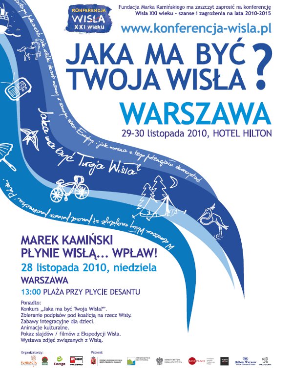 Można śmiało powiedzieć, że Wisła jest naszym narodowym bogactwem. A najcenniejsze jest w niej to, że jest dzika i nieprzewidywalna… Ta opinia Marka Kamińskiego opiera się o jego doświadczenia, obserwacje i liczne dyskusje prowadzone podczas dwóch kajakowych spływów biegiem Wisły. Piękno i różnorodność fauny i flory ekosystemu Wisły stawiają ją w czołówce dziedzictwa przyrodniczego Europy. To paradoksalna sytuacja. Jest to efekt odwrócenia się Polaków od Wisły, który może zostać zaprzepaszczony, jeżeli nie zostanie stworzony kompleksowy plan działań na rzecz Wisły, uwzględniający kwestie ekologiczne, ekonomiczne i turystyczne. Dlatego Fundacja Marka Kamińskiego prowadzi dyskusję na temat przyszłości Wisły, której celem jest wypracowanie wspólnego stanowiska i zawarcie go w liście intencyjnym “O współpracy przy kampanii na rzecz Wisły”. Ważnym krokiem na tej drodze jest konferencja „Wisła XXIw. Szanse i zagrożenia 2010-2015.”, którą Fundacja organizuje pod koniec listopada. (www.konferencja-wisla.pl)