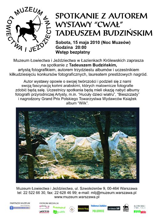Wydarzeniem wieczoru będzie spotkanie z artystą fotografem Tadeuszem Budzińskim, autorem wystawy „Cwał”. Spotkanie odbędzie się na wystawie czasowej o godzinie 20:00. Autor opowie o swojej fascynacji końmi arabskimi, których malownicze fotografie zdobić będą salę. Uczestnicy spotkania będą mieli okazję do nabycia albumów fotografii przyrodniczej Budzińskiego, m.in. „Hucuły dzieci wiatru”, „Bieszczady” i nagrodzony Grand Prix Polskiego Towarzystwa Wydawców Książek album „Wilk”.
