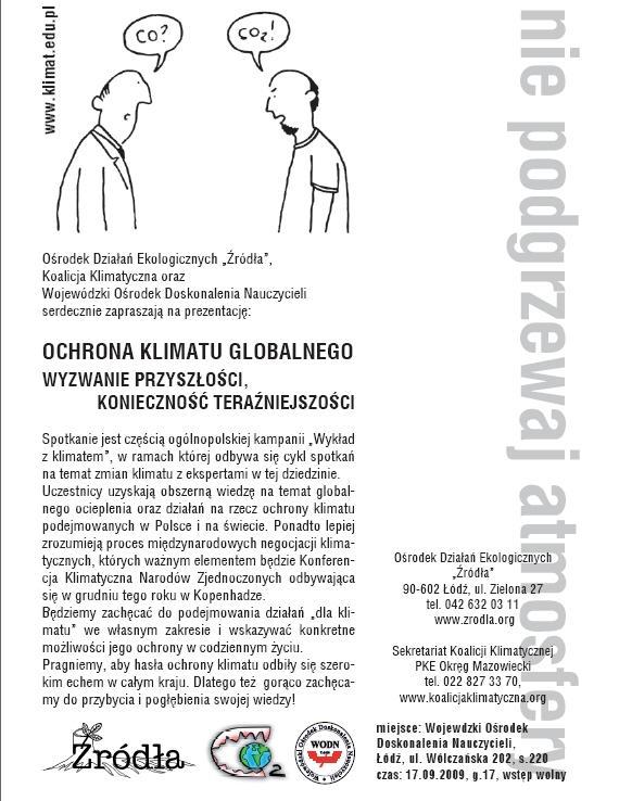 Ośrodek Działań Ekologicznych “Źródła”, Koalicja Klimatyczna oraz Wojewódzki Ośrodek Doskonalenia Nauczycieli serdecznie zapraszają na prezentację “Ochrona klimatu globalnego – wyzwanie przyszłości, konieczność teraźniejszości”. Spotkanie jest częścią ogólnopolskiej kampanii “Wykład z klimatem”, w ramach której odbywa się cykl spotkań z ekspertami w tej dziedzinie.