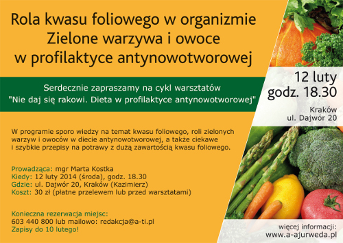 Czym jest kwas foliowy i dlaczego jest potrzebny naszemu organizmowi? Jaką rolę pełnią witaminy B6, B2 i B12 w profilaktyce antynowotworowej? Serdecznie zapraszamy na cykl warsztatów „Nie daj się rakowi. Dieta w profilaktyce antynowotworowej”, które odbędą się w Krakowie, ul. Dajwór 20 (Kazimierz). Pierwsze warsztaty będą poświęcone roli kwasu foliowego w organizmie oraz znaczenia zielonych warzyw i owoców w profilaktyce antynowotworowej. Spotkanie odbędzie się 12 lutego o godz. 18.30.