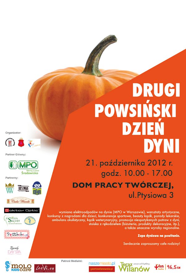 W niedzielę, 21 października 2012 r. Centrum Kultury Wilanów zaprasza na Drugi Powsiński Dzień Dyni. W programie atrakcje i niespodzianki dla dorosłych i dla dzieci. Podczas imprezy będzie można wymienić zużyty sprzęt RTV i AGD na dynie.