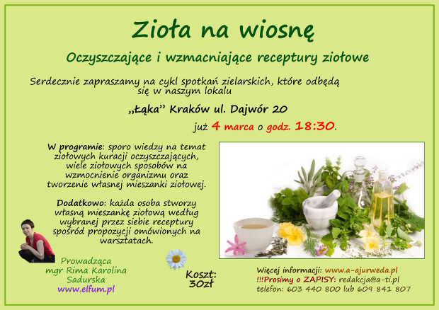 Serdecznie zapraszamy na kolejne warsztaty zielarskie, które odbędą się 4 marca o godz. 18.30, Kraków, ul. Dajwór 20 (Kazimierz). Tematem spotkania będą „Zioła na wiosnę. Oczyszczające i wzmacniające receptury ziołowe”.