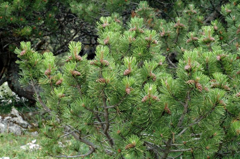 Aby górskiej tradycji stało się zadość, w ogródku skalnym powinien znaleźć się krzew lub małe drzewko iglaste. Nie tylko będzie one ciekawym elementem strukturalnym, atrakcyjnym także w zimie, ale urealni nieco genezę skalniaków. Idealnym kandydatem do tej roli jest oczywiście kosodrzewina, która łatwo znosi każde nachylenie terenu i od razu przywołuje na myśl tatrzańskie wzgórza.