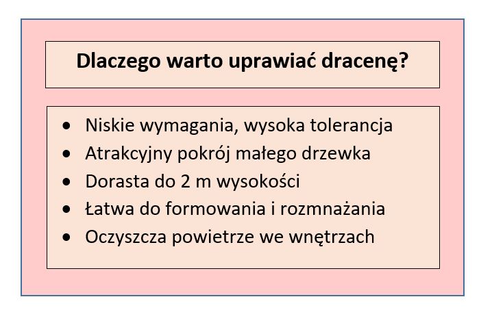 Uwaga: W liściach draceny obecne są saponiny, które są toksyczne dla kotów i psów. Rośliny należy więc umiejscawiać poza zasięgiem domowych zwierzaków.