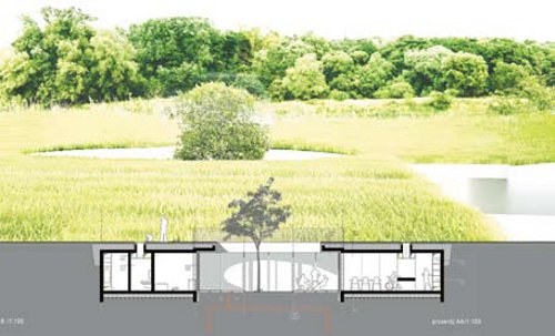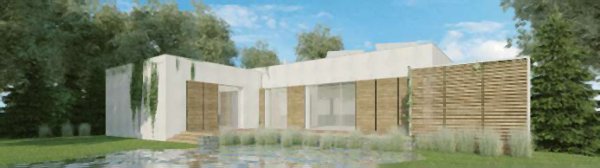 Parterowy dom z pokrytym zielenią płaskim dachem, który pozwala efektywnie ustawić kolektory słoneczne. Konstrukcja żelbetowa. Drewniany taras jest jednocześnie pomostem stawu urządzonego przy domu. Koncepcja zagospodarowania działki i ogrodu sprzyja zachowaniu warunków środowiska naturalnego. Przy domu zaprojektowano trzcinową oczyszczalnię ścieków. Podwodny system kanalizacyjny pozwala na wykorzystanie tak zwanej szarej wody, która po wstępnym oczyszczeniu jest używana do spłukiwania toalet Do ogrzewania domu i wody służą gruntowy zasobnik ciepła, kominek z płaszczem wodnym oraz kolektory. Zastosowano dwustrefowy system wentylacji mechanicznej nawiewno- -wywiewnej z dwoma rekuperatorami. Podział pozwala na wyłączenie wentylacji okresowo nieużytkowanej części domu.