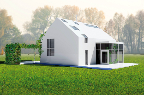 Zwarta, bardzo prosta bryła domu z dwuspadowym dachem i wysokim, przeszklonym ogrodem zimowym. Ogród zimowy jest przekryty pełnym dachem i w zależności od potrzeb może być włączany lub oddzielany od ogrzewanego wnętrza. Zimą pobiera energię słoneczną, w okresie przejściowym podgrzewa wstępnie powietrze do wentylacji, latem jest otwarty lub – kiedy jest zbyt ciepło – oddzielany od salonu, aby zapobiec przegrzewaniu wnętrza. Jest to dom w konstrukcji drewnianej, ze ścianą wewnętrzną z cegły rozbiórkowej akumulującą ciepło. W projekcie zaproponowano możliwość stosowania dwóch systemów wentylacji. Wentylacja mechaniczna nawiewno-wywiewna z odzyskiem ciepła byłaby stosowana w sezonie grzewczym. W miesiącach ciepłych można byłoby korzystać z wentylacji hybrydowej. Bryła i wnętrze specjalnie zostały zaprojektowane tak, aby zapewnić skuteczność wentylacji naturalnej, sterowanej automatycznie Głównym źródłem ciepła jest kominek z płaszczem wodnym na drewno lub na pelety współpracujący z wentylacją mechaniczną z rekuperacją. Centralne usytuowanie kominka sprzyja jego skuteczności jako urządzenia do ogrzewania całego domu. W domu zaprojektowano także kolektory służące do ogrzewania wody w miesiącach słonecznych.