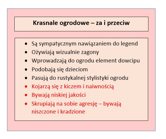 Krasnale ogrodowe nie są jednak propozycją dla każdego. W swoim folkowym charakterze pasują przede wszystkim do ogrodów rustykalnych, naturalistycznych i stylizowanych na bajkowe, gdzie tworzą ważny i naprawdę cenny element całości. Natomiast nowoczesne modele, o dowcipnych formach mogą odnaleźć się na eklektycznych posesjach, gdzie element niespodzianki, intencjonalnego kiczu, a nawet skandalu jest mile widziany.