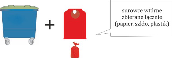 Kolor czerwony = papier, szkło, plastik i metal zbierane razem