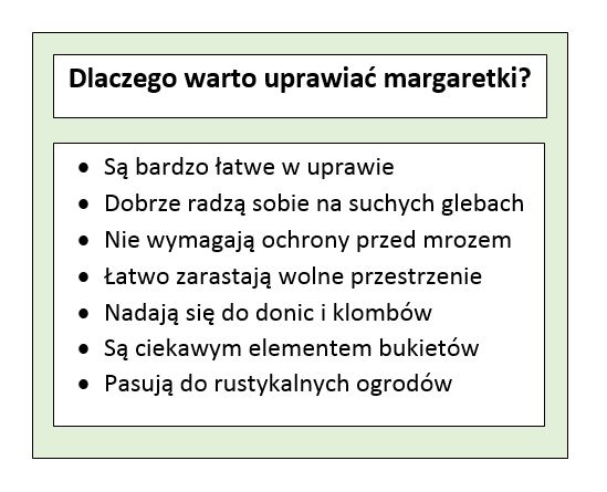 Margaretka właściwa to roślina genialna w swojej prostocie. Można ją polecić wszystkim miłośnikom ogrodów rustykalnych i naturalnych, gdzie odrobina roślinnej samowoli nie stanowi problemu. Naturalnie, powinny stanowić przemyślany element aranżacji, zgadzając się charakterem innych roślin dokoła. Zdecydowanie nie wysadzajmy więc margaretek w towarzystwie egzotycznych kwiatów, krzewów lubiących kwaśną glebę czy iglaków. Pospolite polskie gatunki oraz ozdobne trawy będą za to doskonałym akompaniamentem. A kto preferuje nieco kolorystycznej intrygi, może poszukać w sklepach ogrodniczych odmian margaretek o różowych, niebieskich czy fioletowych kwiatostanach!