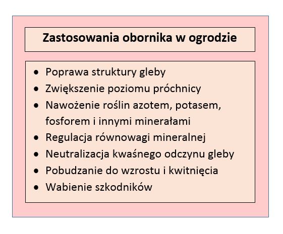 Nawożenie obornikiem powoduje lepszy rozrost pędów, bujniejsze listowie i obfitsze płody w przypadku warzyw i owoców. Paradoksalnie może być również elementem walki ze szkodnikami, takimi jak turkuć podjadek – wystarczy przed nadejściem zimy zakopać głęboko pod ziemią większą porcję obornika. Wiosną będzie można pułapkę wykopać pozbywając się zgromadzonych w niej owadów.
