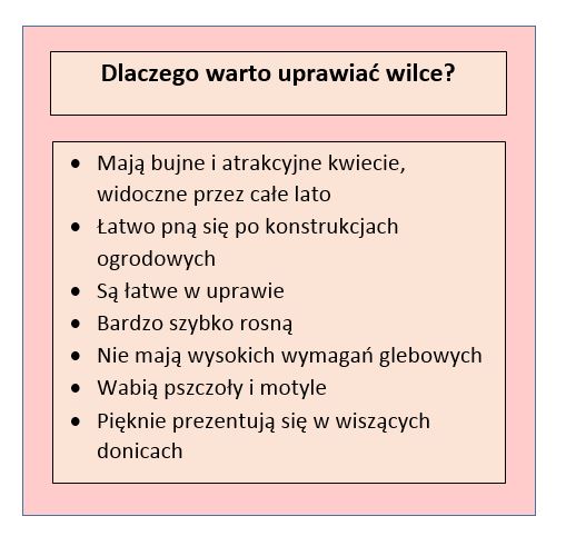 Wilce to rośliny o ogromnym potencjale wzrostowym, które w przeciągu kilku tygodniu są w stanie pokryć duże przestrzenie i to przede wszystkim w orientacji pionowej. Są więc chętnie wykorzystane jako ozdoba altan, pergoli, siatek ogrodzeniowych, a także forma ochrony przed słońcem na tarasach wyposażonych w specjalne drabinki. Listowie pnącza jest na tyle bujne, że faktycznie nie przepuszcza światła. Ponadto wilce bardzo często uprawia się w donicach, korytkach i koszach umieszczonych na podwyższeniu. Kaskady kolorowych kwiatów zwieszają się wówczas urokliwie w dół tworząc zielone parawany na balkonach i tarasach.