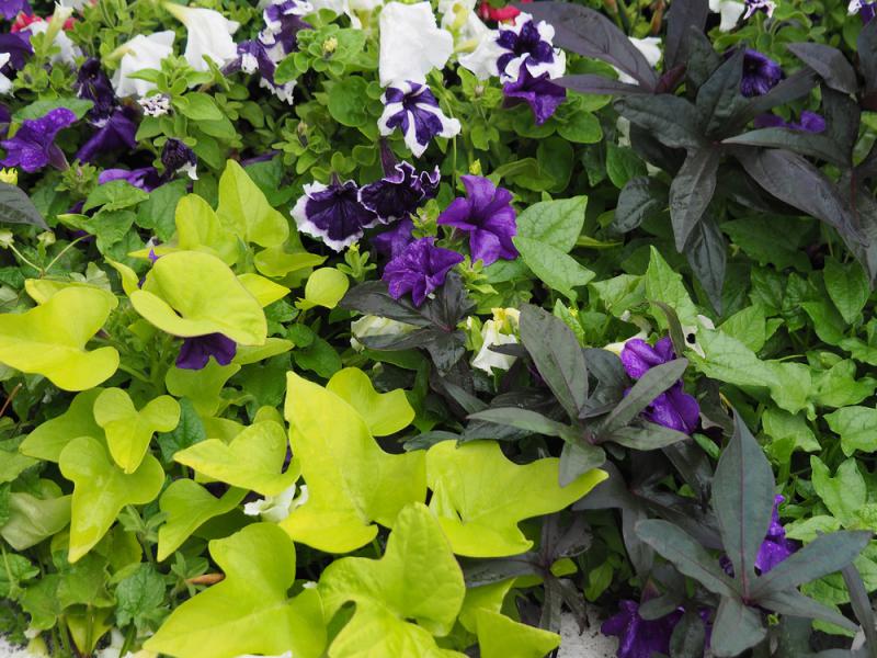 Zielone liście wilca ziemniaczanego w kompozycji z petuniami. Źródło: shutterstock