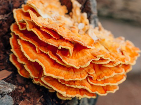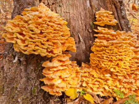 Ten zmielony grzyb rzucony na zdrowe drzewo oczyszczone z kory, zjada je od srodka. (Co powoduje zolciak siarkowy?)