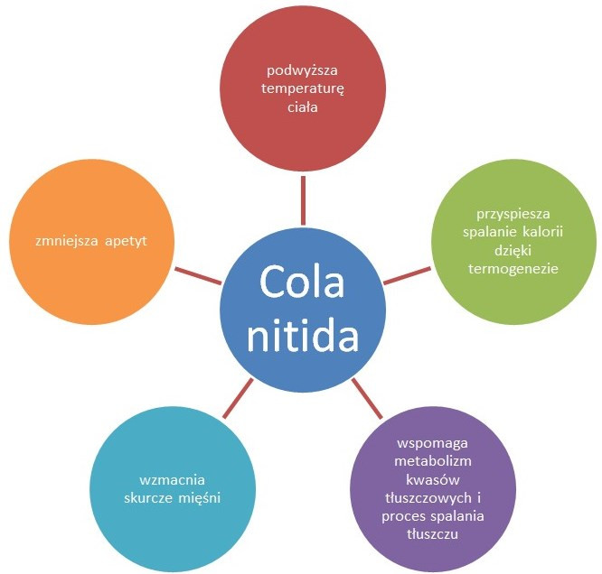Zawarte w owocach i nasionach cola nitida substancje aktywne wpływają na pracę układu krwionośnego i nerwowego, stymulując korę mózgową, ośrodki podkorowe oraz ośrodek oddechowy i naczynioruchowy. Tym samym rozszerzają naczynia mózgowe oraz wieńcowe mięśnia sercowego, zwężając jednocześnie naczynia krwionośne brzucha. Dzięki temu krew z jamy brzusznej przepływa do skóry, tkanki mięśniowej i mózgu, wpływając dodatnio na sprawność fizyczną i umysłową. Za sprawą ekstraktu z cola nitida nasze mięśnie są dobrze ukrwione i mogą szynko reagować na bodźce. Specyfik ten przyspiesza także procesy metaboliczne, wskutek czego serce pracuje lepiej, a wentylacja płuc jest wydajniejsza. Czynniki te sprawiają, że nasz organizm jest dobrze dotleniony, a samopoczucie ulega poprawie. Zawarte w owocach koli błyszczącej związki pobudzają ponadto produkcję soku żołądkowego i usprawniają trawienie, zmniejszając przy tym apetyt. Kolejną cenną właściwością tej rośliny jest jej zdolność do usuwania nadmiaru wody z organizmu. Z tego względu surowiec ten stanowi cenne wsparcie diet odchudzających. Suplementy z cola nitida w składzie to obecnie jedne z najpopularniejszych naturalnych środków odchudzających dostępnych na rynku. Zawierają one zwykle wysuszone lub sproszkowane nasiona. Z racji tego, że zawarte w koli błyszczącej składniki działają wzajemnie się uzupełniając, przyspieszenie procesów metabolicznych przebiega jeszcze bardziej sprawnie. Co ważne, cola nitida wykazuje właściwości termogeniczne. Dzięki temu nasz organizm wytwarza większe ilości ciepła, przyczyniając się tym samym do większego zużycia energii, a, co za tym idzie, uszczuplania rezerw energetycznych występujących w formie tkanki tłuszczowej.