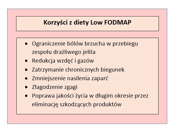 Ogólnie, dieta Low FODMAP obiecuje poprawę jakości życia poprzez zmniejszenie nasilenia przykrych symptomów jelitowych nawet o 70-80%! Szczególnie poleca się ją osobom, u których podstawowe zmiany typu wykluczenie alkoholu, kofeiny i ostrych przypraw nie przyniosły spodziewanych rezultatów.