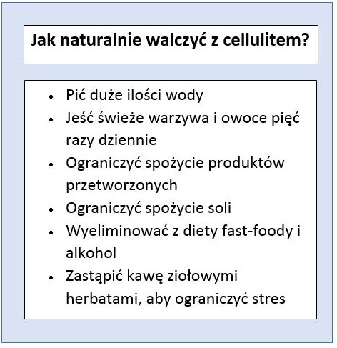 Racjonalniejszym podejściem wydaje się więc wybór zdrowego stylu życia, który może zasadniczo wpłynąć na stan zaawansowania cellulitu, a dodatkowo przynosi mnogie korzyści, m.in. w zakresie prewencji chorób cywilizacyjnych. Oprócz wspomnianej wyżej diety poleca się przede wszystkim unikanie spędzania długich godzin w pozycji stojącej lub siedzącej.