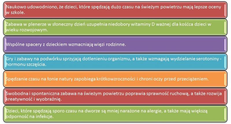 Mimo wszystko jednak warto, aby dzieci spędzały jak najwięcej czasu na świeżym powietrzu. Gry i zabawy plenerowe w towarzystwie rówieśników lub rodziców sprawią, że nasze pociechy będą się prawidłowo rozwijać, a także staną się zdrowsze i szczęśliwsze.