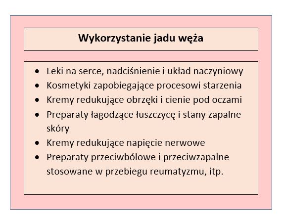Od połowy XX w. poszczególne substancje obecne w jadzie węża zaczęły być wykorzystywane do produkcji konkretnych leków. I tak na przykład na bazie trucizny wyizolowanej ze ślinianek gatunków należących do rodzaju Bothrops leczy się dziś nadciśnienie, udary, embolię płucną, zawały, zakrzepicę żył głębokich oraz zawały serca. Na te ostatnie stosuje się również preparaty na bazie toksyny efy piaskowej, zaś grzechotniczek karłowaty wydziela jad pomocny przy ostrym zespole wieńcowym. W fazie testów klinicznych znajdują się leki na bazie jadu mokasynów, które mają przeciwdziałać skutkom ostrego udaru niedokrwiennego oraz obwodowej tętniczej niedrożności naczyniowej (El-Aziz i in., 2019).