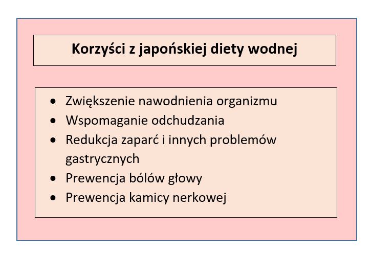 Japońska dieta wodna ma wydatnie wspierać proces chudnięcia, łagodzić problemy gastryczne, zapobiegać chronicznym i nawracającym bólom głowy oraz przeciwdziałań kamieniom nerkowym. Zdaniem zwolenników pomaga ona również odzyskać energię do życia, redukuje nadciśnienie i zaburzenia miesiączkowe oraz wspiera prawidłowe działanie układu moczowego. Najbardziej śmiałe hipotezy sugerują wręcz jej potencjał w zakresie leczenia cukrzycy, zaburzeń pracy serca, a nawet chorób nowotworowych.