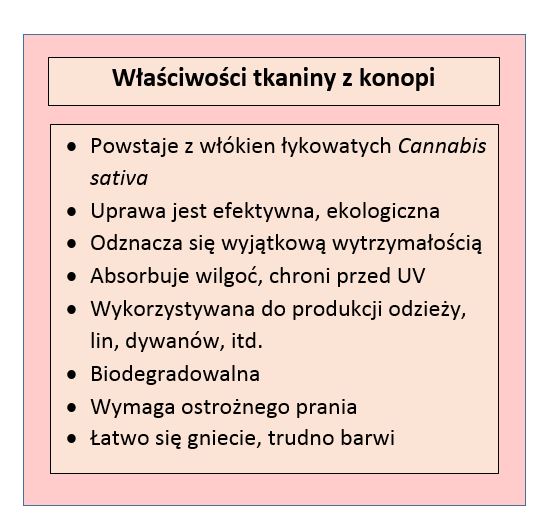Konopna tkanina słynie przede wszystkim ze swojej wytrzymałości – uważa się ją za najsilniejszą i najtrwalszą ze wszystkich tkanin naturalnych. Przez długie lata utrzymuje przy tym oryginalny kształt, nie wypychając się i nie wyciągając. Z czasem ulega jedynie zmiękczeniu, co w aspekcie odzieży jest zazwyczaj cechą pożądaną. Oferuje również aktywną ochronę przed promieniowaniem UV, co sprawia, że jest szczególnie chętnie wykorzystywana do produkcji ubrań na lato. Łatwo pochłania wilgoć i jest dość lekka, a przy tym może podołać i trudniejszym warunkom klimatycznym. Z konopnego włókna oprócz odzieży produkuje się również liny, dywany oraz inne tekstylia domowe i przemysłowe.