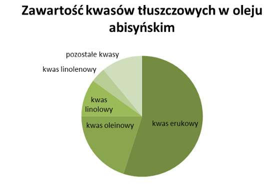 Kwas erukowy to jednonienasycony kwas tłuszczowy z grupy omega-9. Jest substancją trującą, a ponieważ olej abisyński zawiera jej naprawdę dużo, nie nadaje się przez to do spożycia. Co ciekawe, niewiele tylko mniejszą ilością (około 40-50 proc. zawartości) kwasu erukowego cechuje się rzepak, przez co pozyskiwany z niego olej przez długi czas był uważany za szkodliwy.
