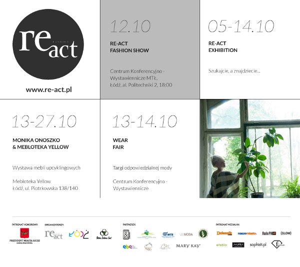Trwają ostatnie przygotowania do Re-Act Fashion Show- jednego z najważniejszych międzynarodowych konkursów mody ekologicznej. Do Łodzi przyjadą projektanci tworzący w nurcie odpowiedzialnej mody. 12 października w centrum konferencyjno-wystawienniczym MTŁ wybrane zostaną najlepsze projekty. 21 finalistów z Polski i zagranicy powalczy o tytuł Re-Kreatora 2012 oraz nagrodę główną Prezydenta Miasta Łodzi – 15 000 złotych.