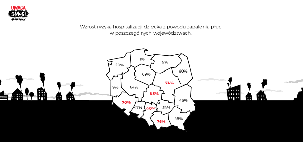 – W najbardziej zanieczyszczonych miejscach w Polsce ryzyko zakażenia dolnych dróg oddechowych, np. zapalenia płuc czy oskrzeli, rośnie u małych dzieci o ponad 25 proc. w skali roku. Ponadto epizody smogowe mogą zaostrzać objawy zapalenia płuc i powodować konieczność leczenia dziecka w szpitalu. Ryzyko hospitalizacji dzieci z zapaleniem płuc w dniu z najbardziej zanieczyszczonym powietrzem w roku rośnie o co najmniej 12 proc. Taka skala problemu dotyczy obszarów, na których znajduje się aż 1000 przedszkoli – powiedział Łukasz Adamkiewicz z Fundacji #13, współautor raportu.