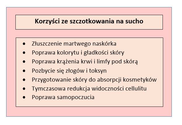 Szczotkowanie na sucho jest przede wszystkim bardzo skuteczną metodą złuszczania martwego naskórka, który codziennie gromadzi się na powierzchni naszego ciała i powoduje suchość, szarość i widoczny brak elastyczności. Włosie szczotki nie tylko fizycznie usuwa niepotrzebne już komórki, ale także odblokowuje pory i tym samym pomaga oczyszczać skórę ze złogów, toksyn i zanieczyszczeń. W długim okresie czasu zapobiega to tworzeniu się stanów zapalnych, wyprysków, zaskórników, itd. Oczyszczona skóra łatwiej eliminuje pot i łój i bardziej efektywnie chroni się przed infekcjami.