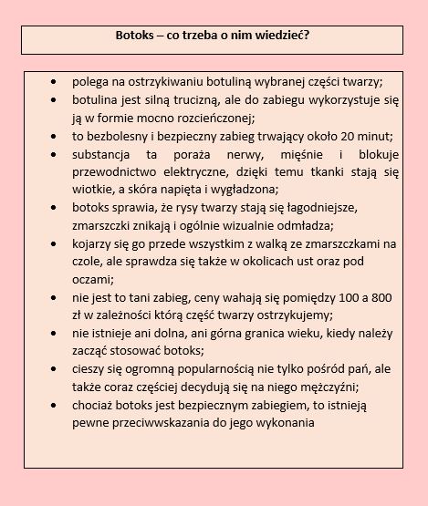 Botoks, nazywany też jadem kiełbasianym, to popularny zabieg kosmetyczny, który sprawia, że rysy twarzy stają się łagodniejsze, wygładzają się zmarszczki. Polega na wstrzykiwaniu igłą małej ilości toksyny w wybrane miejsce. Chociaż kojarzy się go przede wszystkim z walką ze zmarszczkami, ale sprawdza się także w okolicach ust, pod oczami, a nawet na włosach. Botoks to najpopularniejsza nazwa botuliny – jednej z najsilniejszych naturalnie występujących toksyn. Popularnie nazywa się ją także jadem kiełbasianym, ponieważ w naturalnych warunkach powstaje w zepsutych wędlinach i konserwach. Substancja ta poraża nerwy, mięśnie i blokuje przewodnictwo elektryczne, dzięki temu tkanki stają się wiotkie, a skóra napięta i wygładzona. Do zabiegów kosmetycznych botulinę wykorzystuje się w formie mocno rozcieńczonej, dlatego zabieg uważa się za bezpieczny.