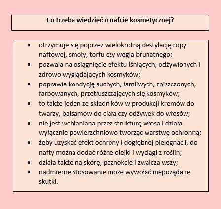 Nafta kosmetyczna to po prostu płynna parafina (Parafinum liquidum), którą otrzymuje się poprzez wielokrotną destylację ropy naftowej oraz innych surowców, takich jak smoła słupkowa, torf czy węgiel brunatny. Charakteryzuje się żółtym kolorem i niezbyt przyjemnym zapachem. Chociaż pochodzenie tego produktu może wzbudzać niepokój, nafta kosmetyczna występuje jako składnik wielu kosmetyków, których na co dzień używamy, np. kremów czy balsamów. Jednak najczęściej stosowana jest jako specyfik do pielęgnacji włosów i skóry głowy. Nafta kosmetyczna była znana i używana od wielu pokoleń. W ekspresowym tempie pozwala na osiągnięcie efektu lśniących, odżywionych i zdrowo wyglądających kosmyków. Ze względu na niską cenę, producenci kosmetyków stosują ją jako jeden ze składników w produkcji kremów do twarzy, balsamów do ciała czy odżywek do włosów. Kuracja naftą kosmetyczną znacznie poprawia kondycję suchych, łamliwych, zniszczonych i farbowanych kosmyków. Substancja ta może być także nakładana na każdy rodzaj włosów, również na te przetłuszczające się, ale jedynie w niewielkich ilościach.