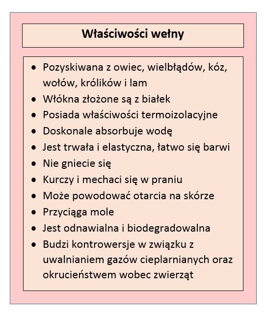 Ponadto wełna jest stosunkowo lekka, odporna na gniecenie i łatwa do barwienia, co pozwala otrzymać piękne kolory i wzory na tkaninach. Idealnie dopasowuje się do ciała, a jej najlepsze gatunki są bardzo przyjemne w dotyku i stwarzają efekt ekskluzywności.