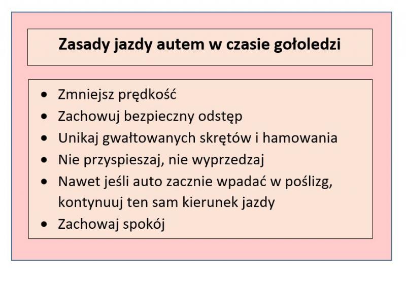 Tabela przedstawiająca podstawowe zasady zachowania bezpieczeństwa na drodze w czasie gołoledzi; opracowanie własne
