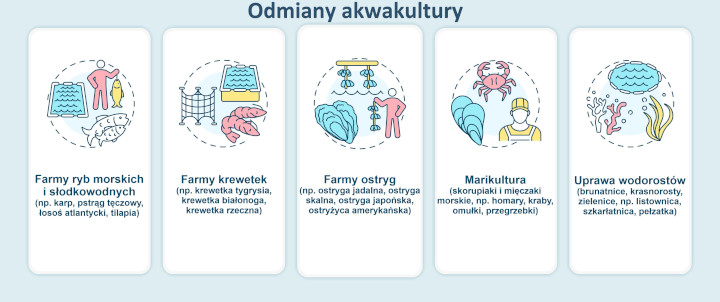 - akwakultury morskie (marikultury) – hodowla lub uprawa gatunków morskich na wydzielonych odcinkach wód otwartych, lagunach, ujściach rzek, płytkich wodach przybrzeżnych lub zbiornikach i kanałach wypełnionych wodą słoną;