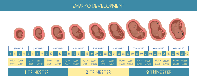 Drugi trymestr ciąży, trwający od 14 do 26 tygodnia ciąży, jest okresem znacznego przyrostu długości i ciężaru ciała oraz intensywnego rozwoju układu nerwowego. Płód wykazuje coraz większą aktywność; silne ruchy płodu w macicy (tzw. kopanie) są odczuwane przez matkę oraz widoczne przez powłoki brzuszne. Wzrasta częstotliwość pracy serca (110-150 uderzeń na minutę); tętno płodu może być słyszane za pomocą stetoskopu. Drogi oddechowe płodu zbudowane są z krtani, tchawicy, oskrzeli i oskrzelików; rozwijają się pierwsze pęcherzyki płucne. Na głowie, łukach brwiowych i powiekach płodu zaczynają rosnąć włosy, na palcach pojawiają się linie papilarne i paznokcie. Pod koniec drugiego trymestru ciąży płód osiąga 30 cm długości i ciężar 50-70 g. Trzeci trymestr ciąży, trwający od 27 do 40 tygodnia ciąży, jest okresem przystosowania się płodu do życia poza organizmem matki (życia pozamacicznego). Następuje ostateczny rozwój tkanek i narządów, rozwijają się półkule mózgowe, pojawiają się zwoje nerwowe. Aktywność ruchowa płodu zmniejsza się ze względu na coraz bardziej ograniczoną przestrzeń w jamie macicy. Dobrze wykształcone są odruchy (np. odruch ssania, odruch chwytania). Większość ciała płodu pokryta jest meszkiem płodowym (lanugo), który zrzucany jest przeważnie przed porodem. Pod koniec trzeciego trymestru ciąży płód osiąga ok. 50 cm długości i ciężar 3-4 kg. Fizjologicznym zakończeniem ciąży jest poród, polegający na wydaleniu płodu i popłodu (łożyska i błon płodowych) z organizmu matki przez pochwę pod wpływem serii silnych i rytmicznych skurczów macicy (tzw. skurczów porodowych).