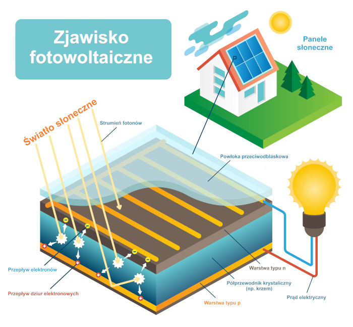 Zjawisko fotowoltaiczne polega na generowaniu siły elektromotorycznej, czyli czynnika wywołującego przepływ prądu elektrycznego, pod wpływem cząstek światła (fotonów) padających na półprzewodnikowe złącze p-n w ogniwie fotowoltaicznym: