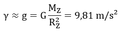 Natężenie pola grawitacyjnego (γ) występującego w pobliżu powierzchni Ziemi osiąga wartość zbliżoną do wartości przyspieszenia ziemskiego (g):