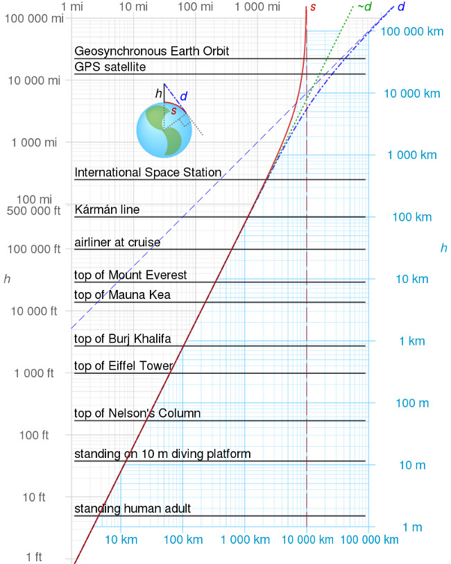 Powyższy wzór ma zastosowanie w przypadku, gdy wysokość oczna obserwatora (h) jest znacznie mniejsza od długości promienia Ziemi (np. obserwacji prowadzonej w pobliżu powierzchni Ziemi, z dachu 100-metrowego wieżowca bądź ze szczytu górskiego
