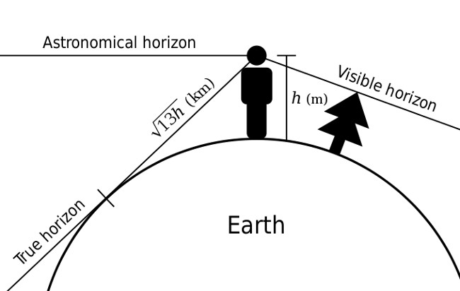 Wielkość obniżenia horyzontu prawdziwego w stosunku do horyzontu astronomicznego dla zwykłych obserwacji prowadzonych z powierzchni Ziemi (gdzie h jest wysokością wzniesienia oczu obserwatora ponad powierzchnię Ziemi) jest niewielka; jednak wraz z rosnącym wzrostem wysokości położenia obserwatora staje się coraz bardziej znacząca.