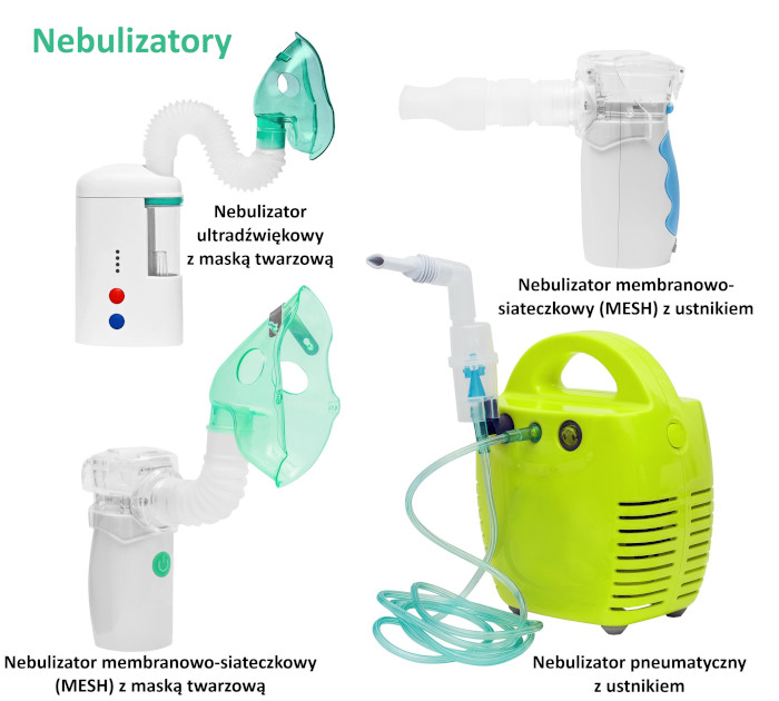 - inhalator (nebulizator) membranowo-siateczkowy (MESH) – urządzenie składające się z komory nebulizacyjnej rozpraszającej roztwór lub zawiesinę substancji leczniczej do postaci aerozolu przy pomocy wibracji; perforowanej membrany generującej drgania o niskiej częstotliwości i aplikatora (maski twarzowej, ustnika, końcówki nosowej).