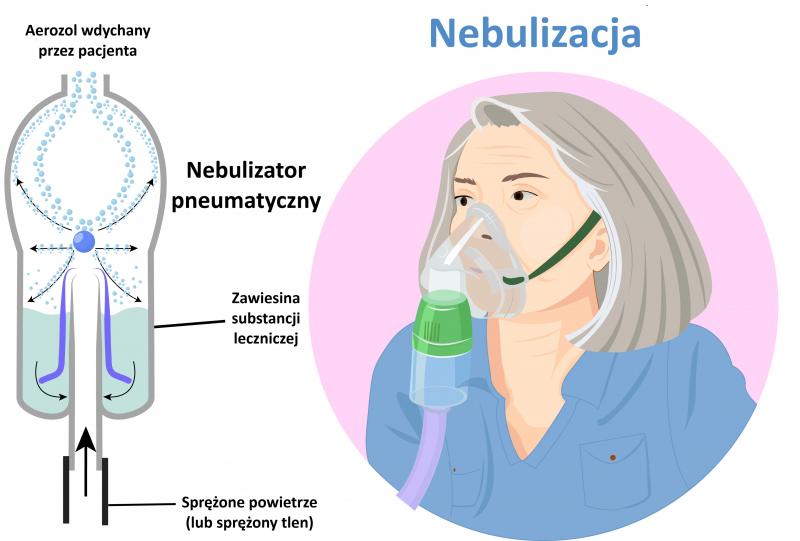 - inhalator (nebulizator) pneumatyczny – urządzenie złożone z komory nebulizacyjnej rozpraszającej roztwór lub zawiesinę substancji leczniczej do postaci aerozolu przy pomocy sprężonego powietrza (tlenu); kompresora (sprężarki); gumowego wężyka tłoczącego powietrze i aplikatora (maski twarzowej, ustnika, końcówki nosowej);