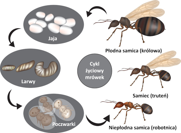 Królowe gatunków monogynicznych, np. hurtnica pospolita (Lasius niger), po odbyciu lotu godowego samodzielnie zakładają nowe mrowisko, a po złożeniu jaj wychowują pierwsze pokolenie robotnic (tzw. haplometroza). Królowe gatunków poligynicznych, np. wścieklica zwyczajna (Myrmica rubra), wspólnie zakładają gniazdo (tzw. pleometroza) lub przyłączają się do istniejącej kolonii. Królowe gatunków pasożytniczych, np. mrówka rudnica (Formica rufa), wchodzą do gniazd innych mrówek i z czasem przejmują kontrolę nad mrowiskiem.