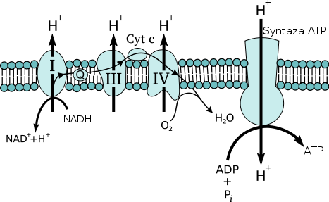 Transport elektronów i fosforylacja oksydacyjna (synteza ATP) są powiązane ze sobą poprzez gradient protonów w poprzek wewnętrznej błony mitochondrium. Przepływ elektronów przez łańcuch przenośników powoduje wydzielanie energii, która jest wykorzystywana do przepompowywania protonów wodoru przez wewnętrzną błonę mitochondrium do przestrzeni między błoną wewnętrzną a zewnętrzną. Gradient protonów stanowi źródło energii do syntezy ATP (proces zwany chemiosmozą).