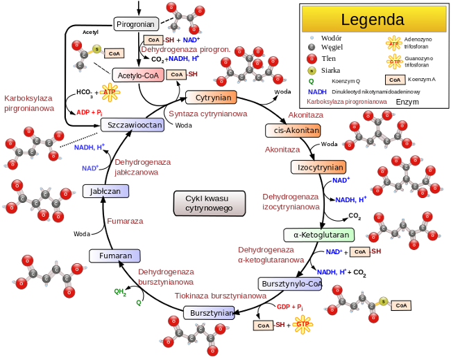 Cykl kwasu cytrynowego, zwany także cyklem Krebsa lub cyklem kwasów trikarboksylowych (TCA), przebiega w mitochondriach. Składa się z ośmiu reakcji, z których każda katalizowana jest przez specyficzny enzym.
