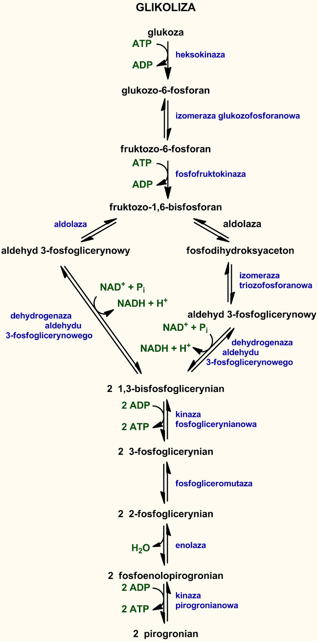 Glikoliza, czyli rozkład glukozy, jest ciągiem około 10 reakcji, w których sześciowęglowa glukoza jest rozkładana do dwóch cząsteczek trójwęglowego pirogronianu, przy czym powstaje NADH (dinukleotyd nikotynoamidoadeninowy – forma zredukowana) oraz ATP.