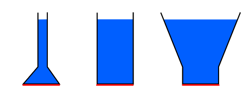 Z powyższych zależności wynika więc, że parcie cieczy na dno naczyń o różnych kształtach, a tym samym o różnych objętościach, przyjmuje jednakowe wartości, jeżeli wysokość słupów cieczy w tych naczyniach oraz pole powierzchni ich podstaw są jednakowe, choć pozornie mogłoby wydawać się, że parcie cieczy na dno powinno być większe w naczyniu o większej objętości.