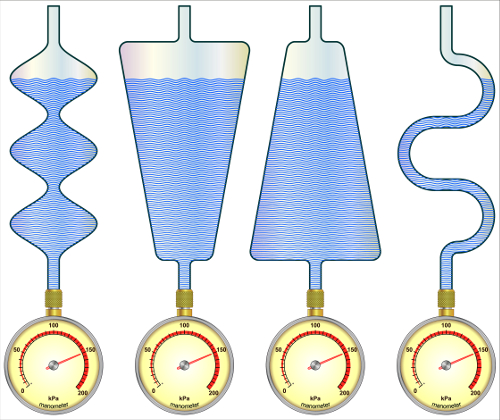 Przyjmując dwie różne objętości naczynia V1 i V2 , gdzie V1<V2, a V1 oznacza objętość słupa cieczy bezpośrednio nad dnem, okazuje się, że siła parcia cieczy zależna od objętości V2 jest większa od siły ciężkości słupa cieczy, od której zależy ciśnienie hydrostatyczne na dnie naczynia. Zależność ta występuje zawsze gdy ściany naczynia nie są idealnie prostopadłe do jego dna. Wartością zmienną jest w tym przypadku siła parcia cieczy na dno naczynia, a nie ciśnienie hydrostatyczne.
