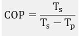 Maksymalny współczynnik wydajności pompy ciepła zależy od różnicy temperatury pomiędzy górnym i dolnym źródłem ciepła (skraplaczem i parownikiem) zgodnie z poniższą zależnością:
