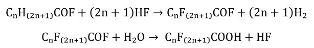 Substancje perfluoroalkilowe (PFAS) powstają głównie w procesie elektrochemicznego fluorowania związków organicznych (np. fluorków kwasów karboksylowych) w obecności bezwodnego fluorku wodoru (ECS, ang. electrochemical fluorination):
